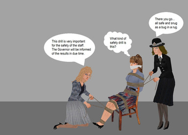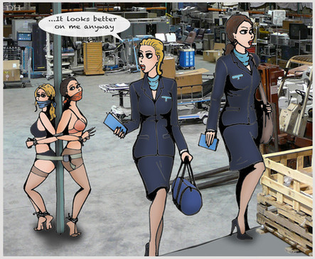 I fantasize as to the order of events: maybe the brunette was first to be secured, after some fighting, which explains for her lacking pumps. Then, the blonde, back from her tour, had to be let herself be tied up, under menace that her colleague would be dispatched if she didn't drop her gun.