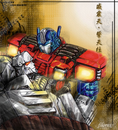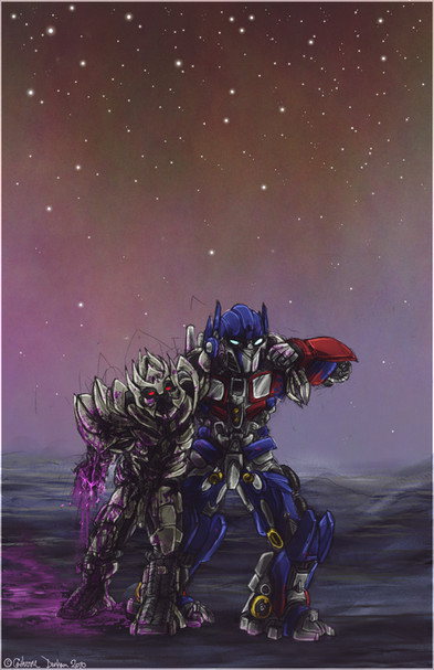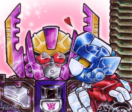 *phew* finally finished colouring this movie Optimus and Megatron pic. Sorta chibi?This turned out looking sorta like a snapshot from an old movie XD *shrug* I guess just imagine watching the Transformers movie 20 years later?