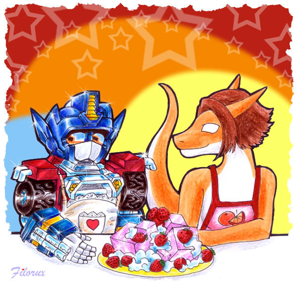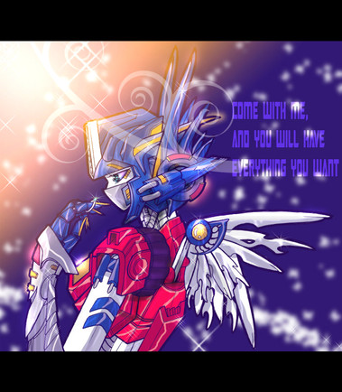 'DON'T be late for dinner this time.' I'm not that creative, but Megatron's just got that gleam in his eyes that says so. Or maybe it just that awesome sparkliness. Prime is looking quite lovely with his Megatron, as always. AND OMG. I'm SO late with my present for you! I've just been so obssessed with Starscream lately that I haven't gotten around to finish it! But I will! I swear! *scitters off to find tablet*