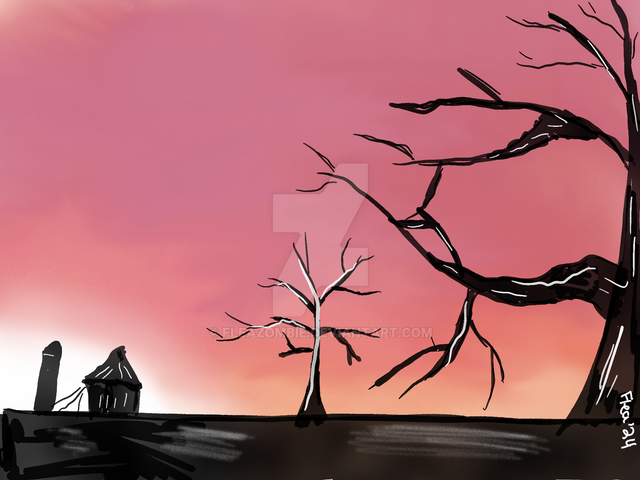 As the time went on, she sipped some water and took a bite or two out of a sandwich. She was drawing and drawing until she noticed that it was getting darker. She liked the way the house she drew looked. Though, truth be told, she got a bit lazy while drawing the background, leaving it looking empty, weird and boring. But it was ok, it wasn’t like she was a professional artist anyways.Closing the sketchbook and putting her pencils into her pencil case, she took some time to stare into the sunset. Though all she could look at was that god damned house. Even if she tried to look away, her eyes would find their ways to get back to it. Now, like a lightning struck through her body, she remembered why that house looked so familiar.