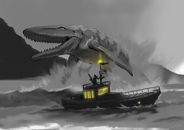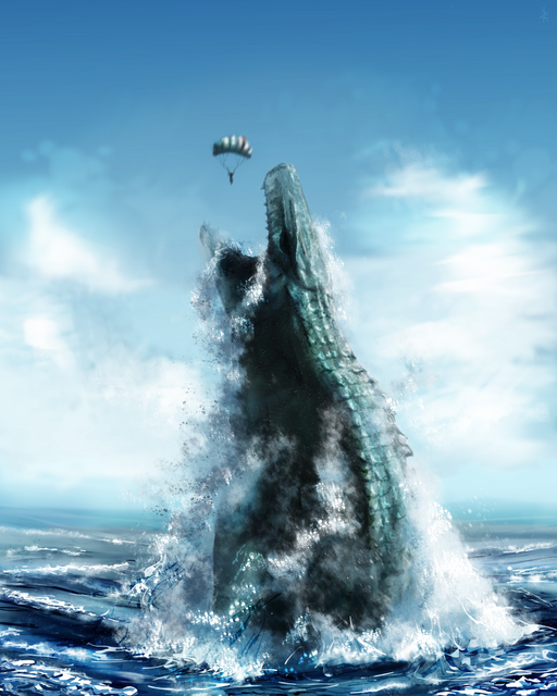 Two lost mercenaries found a boat and used it to cross a treacherous river in hopes of finding supplies. They were not expecting this! (Yeah my little stories are pretty painful XD) This is a fan art of the Hyper Spino from The Isle. This was painted in Photoshop CC and took about 14 hours. Special thanks to tapwing.deviantart.com/ for giving me some advice on values and suggesting I add the pteras to this picture! Thank you for viewing!Check out The Isle here! store.steampowered.com/app/376…
