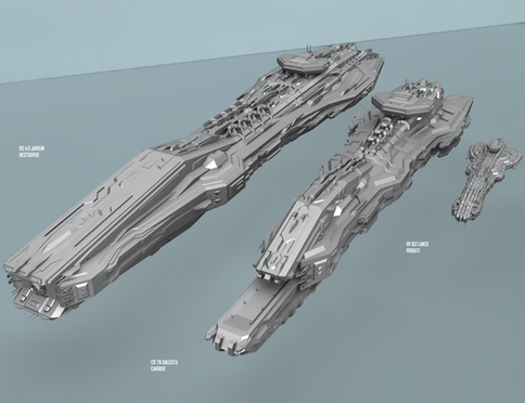 Current ship lineup for a universe I am working on. Sizes are aproximately to scale. The cruiser is about 1.5 km in length. All three are still works in progress.If I ever end up finishing this project, there will be an epic battle between the empire and the union. I'm trying to create a style of capital ship combat that has yet to be seen in movies or games.