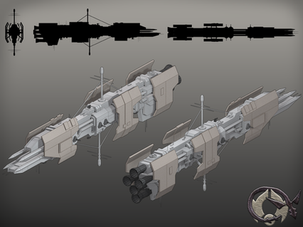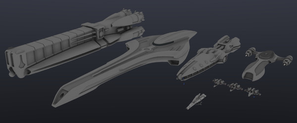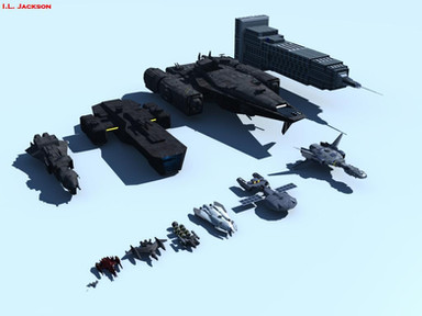 Thanks This was done with 3d studio, with mental ray sun and sky lights. I'm screwing around with different lighting and rendering techniques, to see what works best with differing compositions and moods (although this image doesn't have much of either since I just threw the ships in, to get an idea of what they look like relative to each other