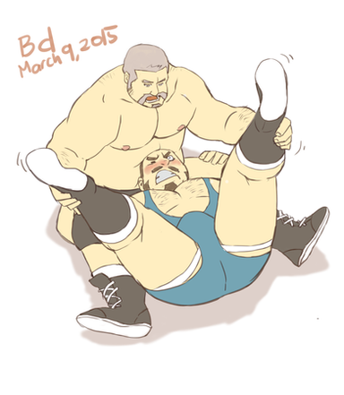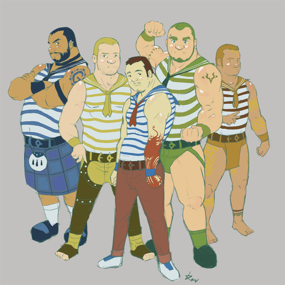 Wonderful colors, expressions, muscles and tubbiness all thrown together... Ha ha... I just noticed the bearded blond bear biting the posterior of the red one! Funny, fun, delightful!