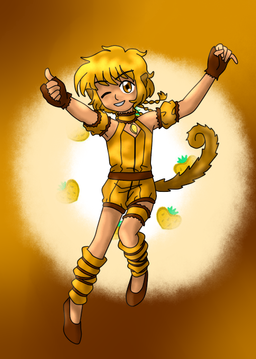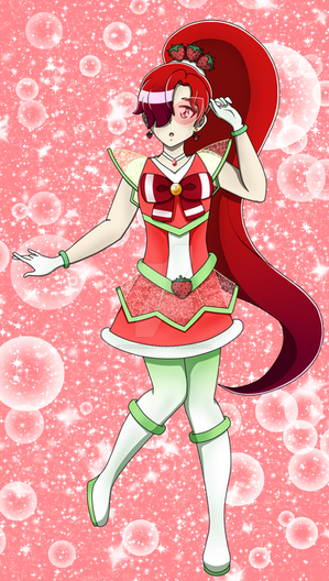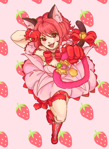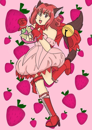 As for her design, like with Strawberry and Lettuce, I shortened her dress flaps, gave her a penguin's tail and a garter, and shortened her gloves. her shoes have small heart clasps and her socks have a band at the top. She also has a mew marrk now, her's in her left shoulder. Also, freckles!