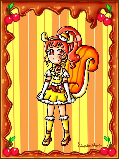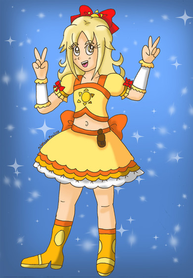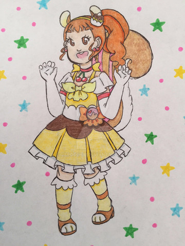 I honestly just. Gave her a belt. That's it. Oh, and darkened her yellow so she looks more like pumpkin pudding, mostly so that a)Retasu is not the only vegetable in the group, and b)Her colors don't clash with how I will redesign Berii. Her skin is also darker, since I can't believe that the girl who spends her afternoons trying to get money to survive is as pale as the other girls.