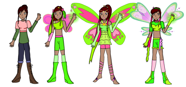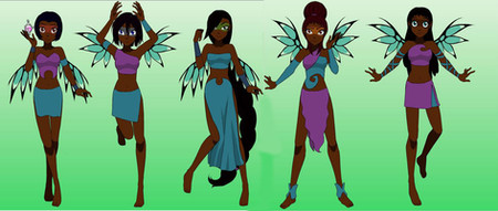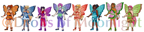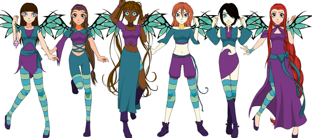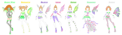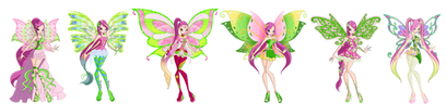 in order: Charmix, Glamourix, Enchantix, Pleiadix (S6 Mythix), Mythix (ver. 2), Silvestrix (Butterflix)