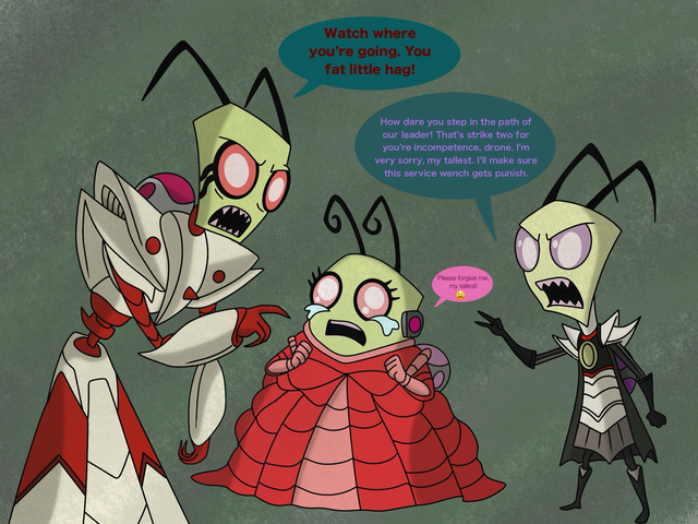 14 year old Zim a his companion Gir was sent to earth by Tallest Purple to see if all types of life would be able to live on planet Earth (Purple wanted this because he saw planet earth as a beautiful planet), and also take note that Tallest Purple and Tallest Red's beliefs are very different Purple prefers peace and Red prefers war (This will lead to problems between the two tallest in the future too). Here's some extra info about Purple and Red - Red prefers spicy foods while Purple prefers sweet foods, and The tallest are 19 feet tall (The other irkens are around the same height as the average human). On the topic of the Tallest Tallest Miyuki and Tallest Spork are in this headcanon too. Info about them can be found on their