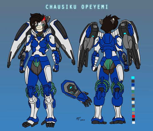 Gauss' equipment consists of a compact exoskeleton powered by a backpack reactor. Her boots greatly enhance her running speed, and allow for short bursts of jet propelled flight. Her arm converts into a makeshift cannon capable of various types of energy ordinance. Lethal options are obviously available, but Gauss prefers non-lethal approaches since it looks better in the public eye.