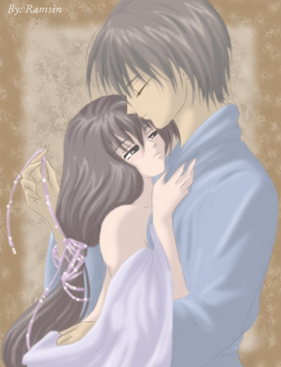 I like this picture so much and I can't really say why. Maybe it's the situation that they are in. It doesn't look naughty at all to me, it looks...more loving, like he's trying to shelter her...sort of? In a way maybe? heh, anyways, awsome picture. It's going into my favorites ^-^