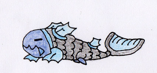 Description: In the waters of the Ramoa Region there have been sightings of Ultra Wormholes appearing underneath the sea. Swimming around those waters are fish-like creatures that can float right out of the surface and into the air. Empty is nothing more than a hollowed out body with floating fins right near it. Inside is nothing more than a single orb of blue light that can be seen through the eye-holes of this beast. This creature has been seen eating but nothing ever seems to come out. People who try to take the orb of light out suddenly have the vitality sucked right out of them. It is said that if you listen carefully you can hear screams of anguish coming from inside this Ultra Beast.