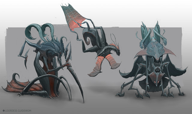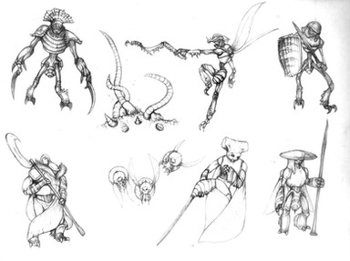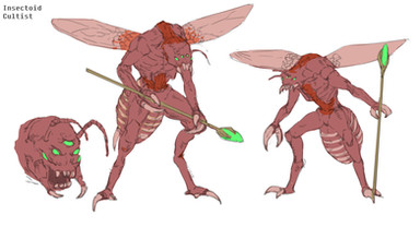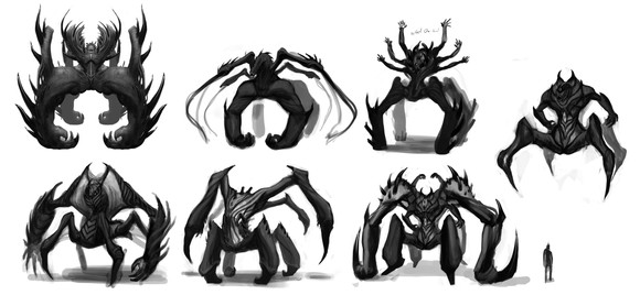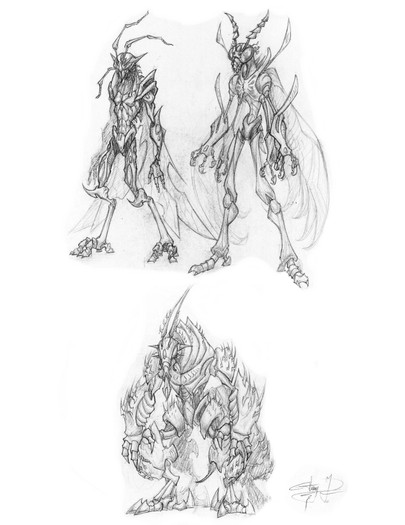 Welp, if you click on the links in the description, you can see I started with something completely different, rather more reptilian/mammalian. But once I hit upon the "bug" idea, I devoured as many reference pictures as I could, and then just when wild pumping out various and sundry body plans. My art director picked a few that he liked, and I synthesized them together to create a basic template for the Insectoids (it was the Everguard, specifically). Once I had the body, I also scribbled a ton of different heads to choose from, and again the art director picked his favorites. From there, I just thought about the individual purposes of the different classes, and how to convey something about that through their appearance. I started with silhouettes, then, looking again at many reference photos, turned them into something anatomically viable (in theory, at least). The step that hasn't been shown yet for the insectoids, but has been for the reptilians [link] is the turnaround, where I get the exact proportions down so a 3D modeller and animator can make the final beast that would appear in-game. Unfortunately, I only got around to this step for the Everguard, but anyway, you can see it soon.