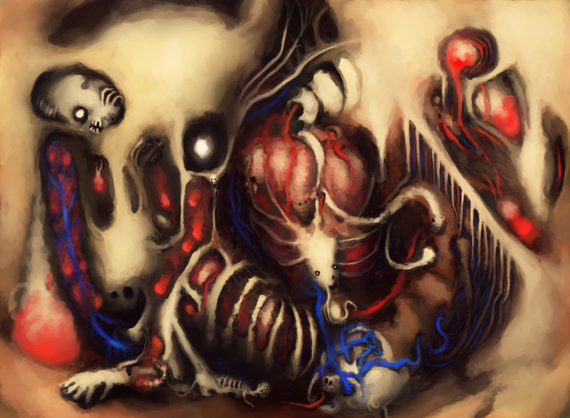 WOW. BIG painting of viscera... I can see the influence of all of your different inspirations in the colors, textures, and composition. I do recognize a few things... But mostly I'm just enjoying the way all the squishy bits make such an interesting composition. I also really like the odd touches of color here and there - pinkish and purple and gold... Very pleasing. Before I even read your description, the first thing that popped into my mind was "DSil has been reading Barlowe's Inferno..."