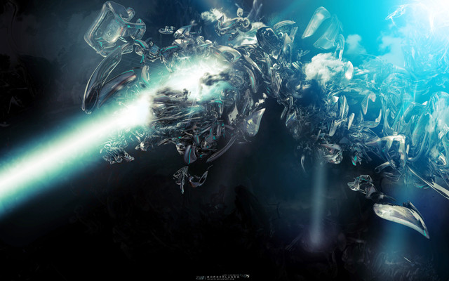 I don't normal make wallpapers. When i render i do them at 1600 x 1200 and i guess this time i just decided not to chop it. This peice has 2 renders, one of them took 7hrs at full quality, and the other took around 1hr and was at minimum quality but it was in a really big resolution. This was to be a collab with arawn, which there still be one with this render, but i got so carried away i continued with my version.// Douglas Spann 2004