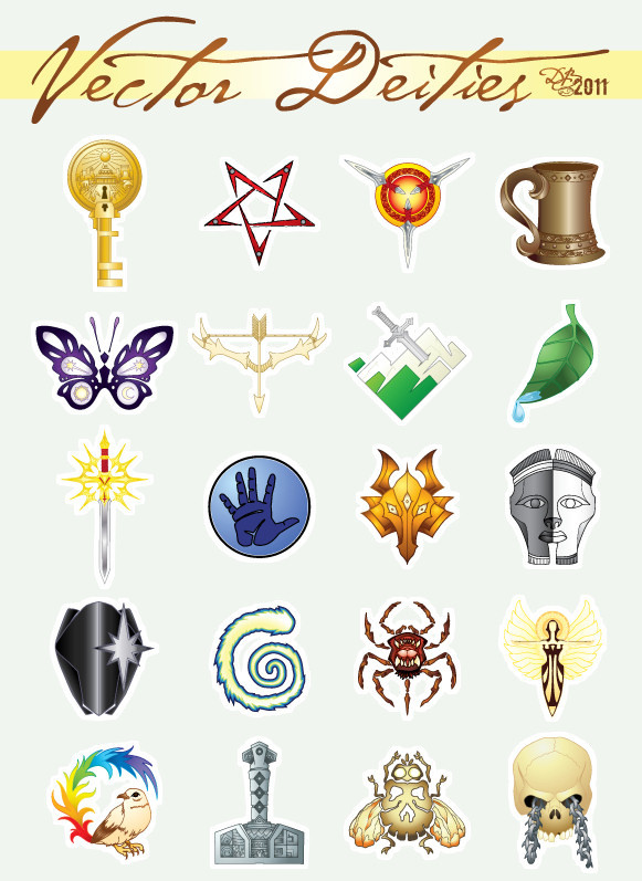 First off, I didn't create the actual designs. They were created by the awesome artists for Pathfinder. All I did was vectorize them.Basicly, I took the art for each of the main Pathfinder deities and vectorized them. When I do the lines for my character arts, I do them in Illustrator, and since I do have many more character arts that will require deity symbols on them, I started this little project to make things eaiser for me later. Then I got to wondering if others would be able to use these for their arts, so I packaged them up to share! There are 3 zip files in here: one with the original Illustrator files, one with EPS files, and one with transparent PNG files. Each has a black and white line art to color yourself, and a simple vector color job. The vector coloring probally isn't the best, but thought it might be handy. I didn't include the original images, though if you want to see the originals, I got them from the Pathfinder wiki.