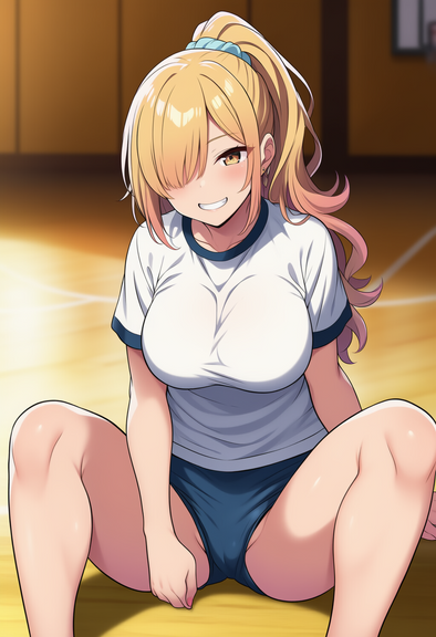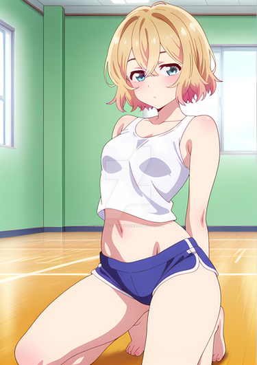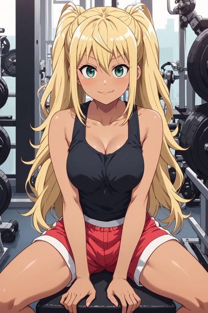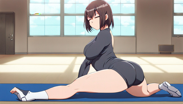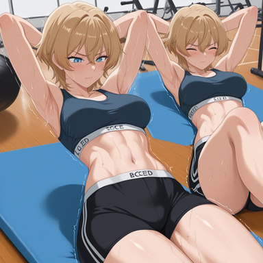 #blush #cleavage #mediumbreasts #oc #shaking #split #sportsbra #sportswear #sweat #trembling #yellowhair #yoga #animemangagirl #bikepants #bagsundereyes #yogamat #redscrunchy #starshappedpupils