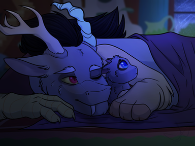 "Dad!"Discord braced himself for the small, excited bundle that collided into him. Jinx squirmed in his grasp, wriggling his way up to bump their snouts together in an affectionate greeting. He giggled vigorously when Discord twirled him in the air.