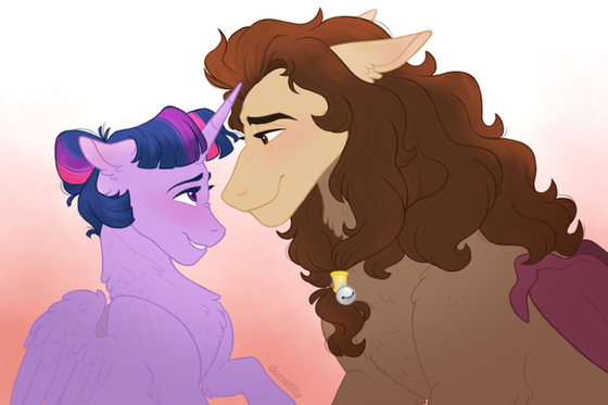 Like I mentioned over here , upon first meeting Scorpan, Twilight would trail after him to bombard/ politely ask a few questions about his history with Starswirl, wanting to know more about how her favorite wizarding hero was like. Scorpan was happy to share his experience with her, charmed by the youngest princess of Equestria who he enjoyed spending time with and likewise asked her questions about the recent events and changes of Equestria. The two began to spend a lot of time together, swapping information and teaching each other new spells, etc. Twilight was the first to develop a huge crush on the gargoyle, while Scorpan was hesitant to feel anything towards her, which he knew he could, before allowing himself to pursue his affections once she gave in first.