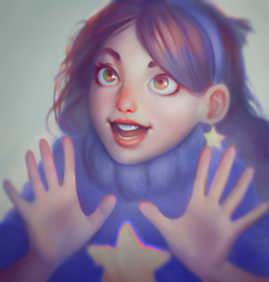 I love how the light reflecting off of the side of her face has several colors in it. This piece looks amazing, keep up the good work!