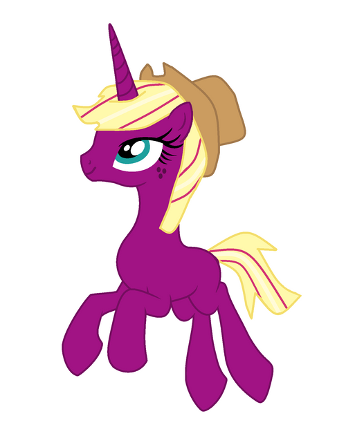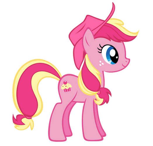 A newer version of Applejack in Cherry Berry's colors. The hat color comes from the "Over A Barrel" episode where Cherry Berry appears with Aj's hat and mane style (minus the hair band and tuft of hair underneath it). Thanks to Pikmanipulator for reminding me about the hat color! I originally had it the same color of green as her hair bands.