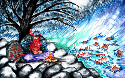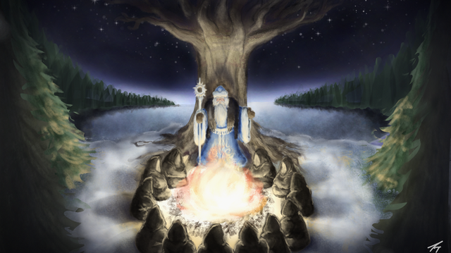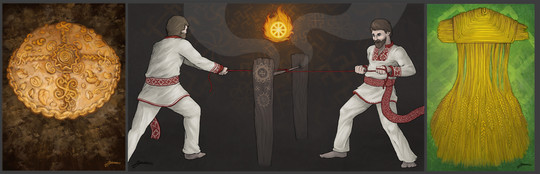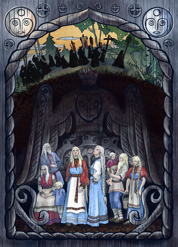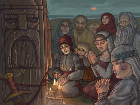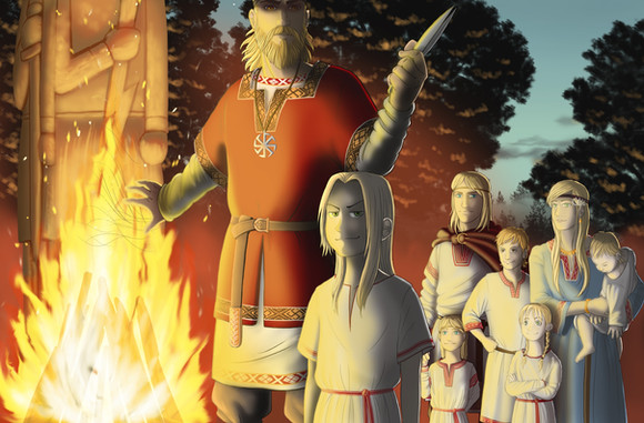 Slavic pagan celebration in front of big idol.I was inspired by one verse from song Заклятье(Incantation) from Russian band Аркона(Arkona) Verse is: "Прими требу, огнём в небо!" and it say: "Receive sacrifices, through fire to the sky!"
