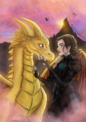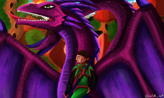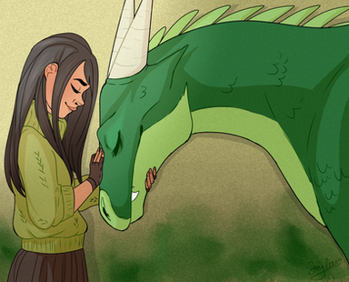 School of Dragons closed down so I drew a little tribute, here's my character with her first dragon, Ladyrum the rumblehorn. 💚