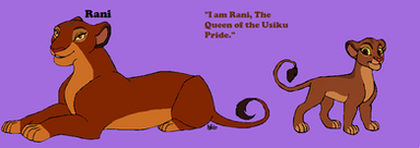 Reading up on Rani's personality, she's described as someone who is headstrong, quick to judge, and stubborn. Obviously, she has a softer and more vulnerable side, but I imagine that's reserved for family and close friends; she's seemed to have lost a lot of family. Not to mention is next in line for the throne, which is being taken up by her very-elderly grandmother. As shown by her images, she was a bit more playful and friendly as a cub, but becomes much more serious as she grows older. Combined with Kion's open-mindedness and friendliness to all creatures, and you've got an interesting power-dynamic of a couple.