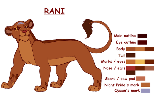 In light of me posting my TLK character profiles to the official King of the Sanctuary Tumblr, and me wanting to get canon characters out there before KotS OCs, I started to work on Lion Guard characters, since they were the only canon lion characters left (I won't be working on hyenas for now) The Night Pride are up first, sans Janna, and Rani's parents (until I can figure out a system for getting their proper colors) So, Rani is up first.
