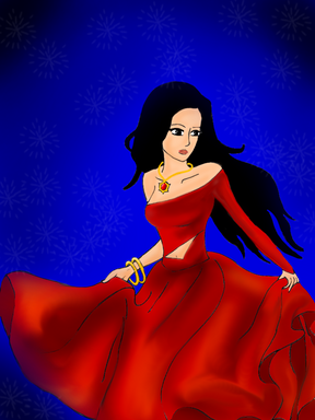 The drawing is great as usual, body proportions all right and a great sense of style, you have ^^. Love the colorful bg, too! Looks like gypsy colors to me! And you know, you're getting alot better at coloring! The shading on her skin looks excellent, just remember that it's shading+highlights like those cylinders on those stupid shading sheets we had to do in Drawing and Painting 1....