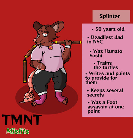 A Teenage Mutant Ninja Turtles and My Little Pony: Equestria Girls Crossover By Dylan Burk."Years Ago, Splinter wasn't always a rat infect not even a mutant one either. He was a earth pony of in age of old Equestria where the Pillars live beofre banishing the sirens and The Pony of Shadows in the limbo with them. Also Splinter is a student of the guard training academy school until he met a beautiful and kindness young unicorn sorceress and even before the member of the pillars, Mistmane. those two got to know each other and even fell in love. You see the love and attention she gets from her friends and family causes her best friend, to become jealous. While Mistmane is away at magic school, and Dating with Splinter, Sable casts a spell to make herself beautiful, but it backfires and makes her hideous instead. As a result, she decides to take beauty away from everyone and everything else, making herself empress and leading the village into a state of decline. When Mistmane with Splinter returns home and finds her friends suffering, They confronts Sable Spirit on her oppression and challenges her to a magic duel, eventually defeating her. Wanting to do more for her friend, Mistmane casts a spell that restores Sable and the village's beauty while sacrificing her own. But Splinter didn't want to let her beauty go away so instead he sacrifice his original body changing into a rat. Sable, moved by her friend's lover's sacrifice, rules with kindness and compassion from then on, and Mistmane still in her young self dedicates her life to spreading beauty throughout Equestria along with Splinter cause she still loves him. Months later, she and the other Pillars were brought together by the unicorn Stygian to battle a great evil but eventually while battling the sirens Splinter jumps on of the them as Starswirl opens a portal to banish them to the Human World. Mistmane frighting tries to warn him but is was too late the portal is closed and Splinter is gone. Mistmane is heartbroken, thought that she lost her beloved forever. Meanwhile in the Human World, Japan, Splinter is alone lonely misses Mistmane. Suddenly he was rescued by a man named Hamato Yoshi showed kind and love and took him in as his pet. Mimicking Yoshi's movements from Splinter's cage, and learning the mysterious art of Ninjitsu. For Yoshi is one of Japan's finest shadow ninja warriors Known as The Foot Clan. His only rival is a man named Oruku Saki, and they competed in all things, but none more fiercely than for the love of a woman, Tang Shen. Shen's love is only for Yoshi, and rather than see him fight Saki for her hand, she persuaded him to flee and Splinter to America, Canterlot City. But Saki, hatred vowed vengeance. So he took over the clan while using his evil leadership The Foot turned into an army of crime. As one month later, Yoshi returned home, to find his beloved Shen lying on the floor murdered. And then he saw her killer. Saki wasted no words, and during the struggle, Splinter's cage is knocked down and broken. Splinter saw his master dead, He got furiously angry, so he leapt to Saki's face, biting and clawing, but he threw him to the floor, and took one swipe with his katana scaring his left side of eve brow and cheek. Then he was gone, and once again Splinter is alone. Few moments later, Splinter while he lost his family, lover and home. He wandering the sewers scavenging for what ever he could find. And then, one day he witnessed an accident. A pet shop owner loaded his new selling, a glass bowl with four baby turtles. An old blind man is crossing the street when he was almost run down by a large truck. The pet shop owner got his attention, rushes to save the old man but knocked the bowl and shatters it and the baby turtles slips to the water draining down the sewers. the Pet shop owner moves the old man out of the way and as the truck swerved, a metal canister bounces out of the back and slides down were the turtles were. Splinter horrified that the canister is heading towards the young ones and rushes to save them but it's too late the canister smashed open releasing a glowing and powerful Mutagen. It causes who ever touched it to take on the form of whatever animal, bug or plant that someone had most recently been contacted with. It beginning to change them, The Turtles stared becoming mutants that had most recently been with humans and Splinter too with Yoshi. And turns them into mutants with intelligence and talking like humans do. While remembering how much Yoshi and Mistmane love him so he decided to show the same love to the turtles he became their father, and they became his sons. But eventually Splinter fears and knew the people of the outside world would not understand and considered them freaks and monster. So he begins training the Turtles Ninjistu that he had learned from Yoshi as their teacher master in 16 years later, so they can learn to protect themselves both mentally and physically and while Splinter took them in since they're were infants, he found a old Renaissance Art book in a storm drain, and chose names for each of them; Leonardo, Michelangelo, Donatello and Rapheal. The Teenage Mutant Ninja Turtles."
