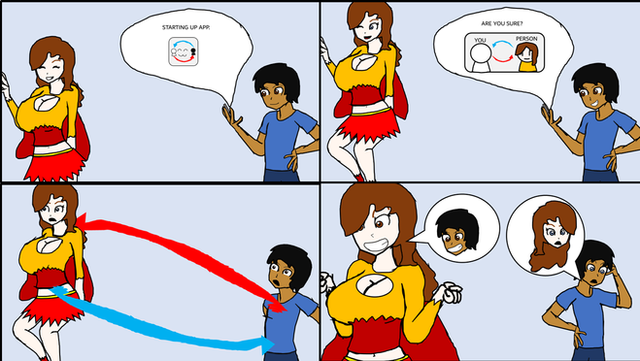 Just a normal and average day, Danny & Lynn were hanging out together. But then, suddenly, the redhead stumbles on something that looks like a toy gun. She accidentally fires it, and they swap bodies, which both seem to be enjoying.This was a commission done by , which me and co-paid for. Thank you both so very much, it's really great to be apart of something like this.