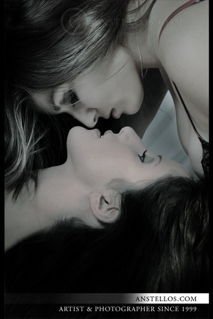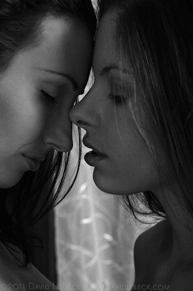 Two striking women so close, yet not quite consummating their heat with a kiss, the fingertips touch, the perfect lipstick, perfect feminine passion...