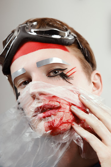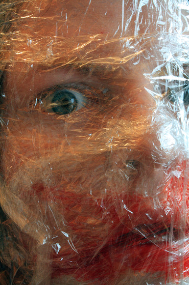 The extrem lighting and your pale skin makes one think of corpses or vampires or even as a symbol of royal blood. The plastic covering reminds me of platic wrap, as if one wanted to keep you fresh so that you don't decay/change. Also it seems to be a saving barier. Like you feel safe behind it and don't have to fear or worry about your surroundings. But best of all is your expression...how can you show so many emotions with your face?! Reluctance, fear, surprise,...your eyes are fighting...