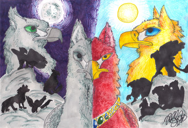Just some fan art for one of the comics I follow on here, called Crescent Wing, by Chaluny & Mikaley.The characters from left to right are Galadreel the Steller's Sea-eagle, Soto the American Kestrel, Arris the New Zealand Falcon, Falani the Peregrine Falcon, and Jooey the Peregrine Falcon.