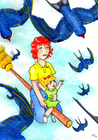 'Tis her character flyin' about on a clear night with a cat pal, and a fox-bat (At least... it's suppose to be).