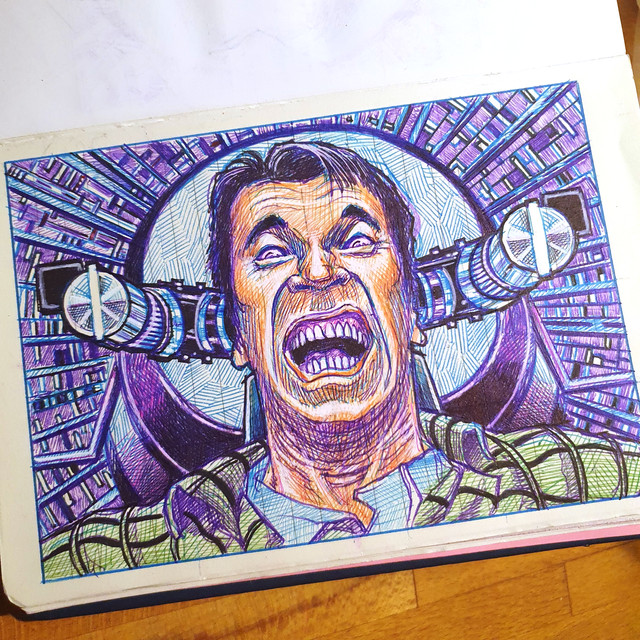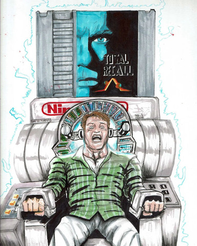 I can't remember what is happening in this scene any more, but seeing your picture, I instantly realized it was Arnold in Total Recall. Brilliant piece, man.
