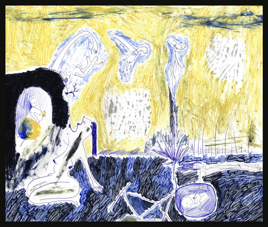 This is really cool. Sketchy and surreal. The figures have so many human features, yet they are grotesque and distorted. The blue fits as well.
