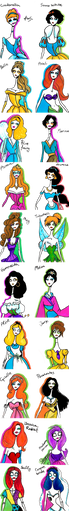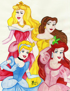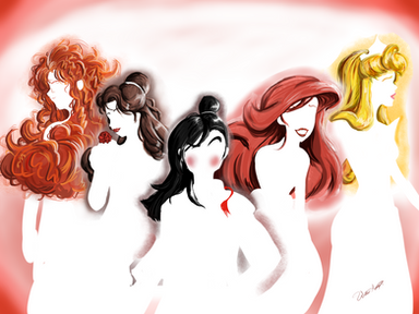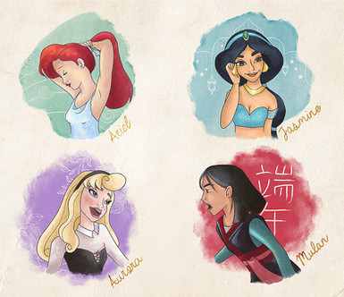 I really dig this style a lot! And the colours in the lower right's dress is super gorgeous. Belle looks so elegant and I really love the dynamics of Ariel. Lovely, lovely work!