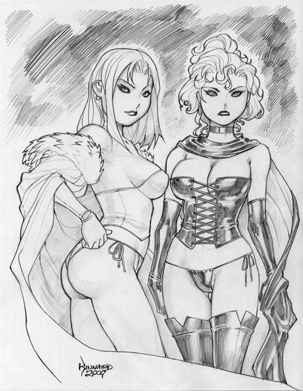 i had one hellava time to figure how i was gonna pull this idea off. i know what ur thinking....it reminds u a lot of the j scott campbell idea of power girl trying to fit into supergirls costume. this was not my idea mind u...and i almost didnt accept it. but hey, who am i to deny one his fantasy idea.when ever u have two figures side by side, u have a good change of it growing stagnant and uni