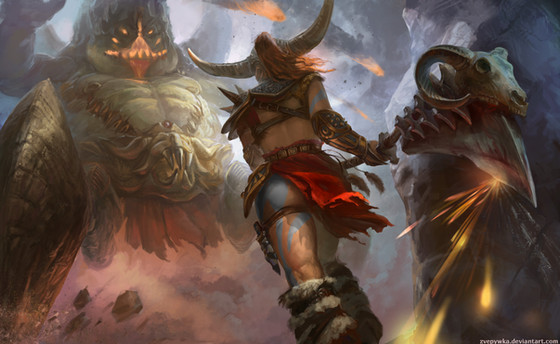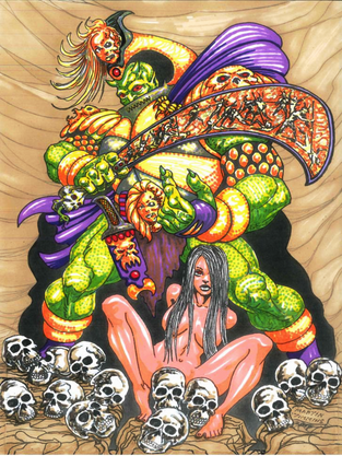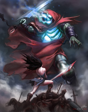 Wow! Nice job on the girl's pose and the creature! I especially love all those skulls in that far corner!