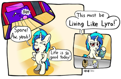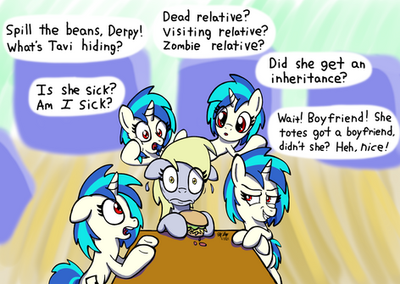 Oh, how I hate to draw such an easy-going pony cry, but I think it'd be neat if the universally-accepted take of the sloppy, lazy Vinyl was actually just overworked and hiding that fact from those around her. A certain orchestra-based mare should really ask her what's up.