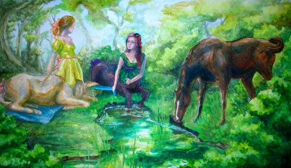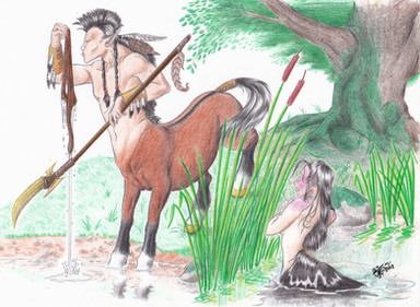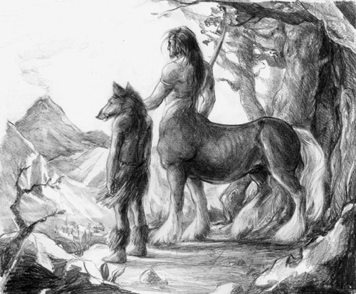 A small gryphon tells a centaur where to find game..