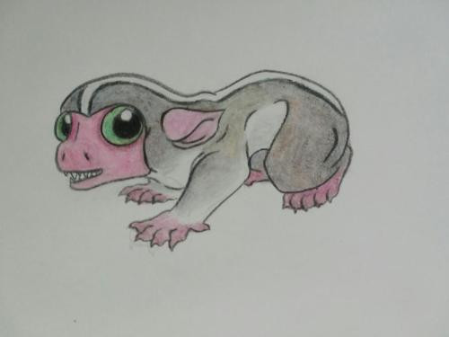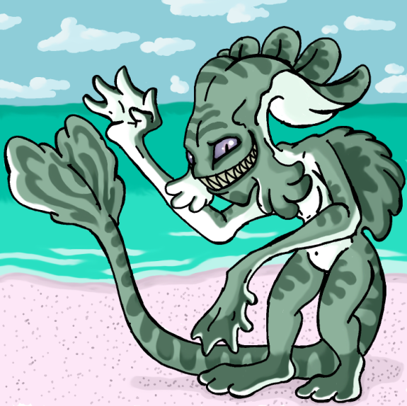 This large gremloid is a creature of the night, shying away from bright lights and inhabiting the very deepest parts of the cedar/fir forests. They feed exclusively on splendour beetles and grubs which it digs out of the trees with its long fingers. elongated limbs assist in leaping along from tree to tree and modified toes with tough toe pads help grip branches with needles. pale coloration during winter helps it blend in with the snow but during summer turns a dusky blue grey and pinkish brown to help camouflage during the day as it sleeps, gripping a branch with its hands so as not to loose balance while resting. ghostlinds are capable of leaping great distances and often defend themselves with kicking when captured.
