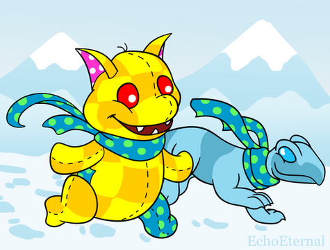 A Mootix parachuting over Faerieland. Inspired by the Neopets Flash game Mootix Drop.