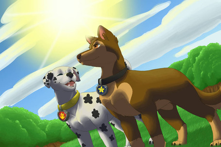 I wanted to try drawing a dynamic angle,and some dramatic shading, so I used my two favourite Paw Patrol Pups as test dummies.When I started colouring this I just drew Marshall as a white dog(I pretty much added the spots last), so for the longest time he didn't look like himself(it was funny, I kept loping at him thinking, "Who are you??") And halfway through colouring this my Photoshop froze and I had to start over from the last time I saved(Which was hours ago ;w; ). This was fun to draw, nonetheless, but I spent a long time on this, and the shading isn't even accurate... Don't click the picture, it get's REALLY big.
