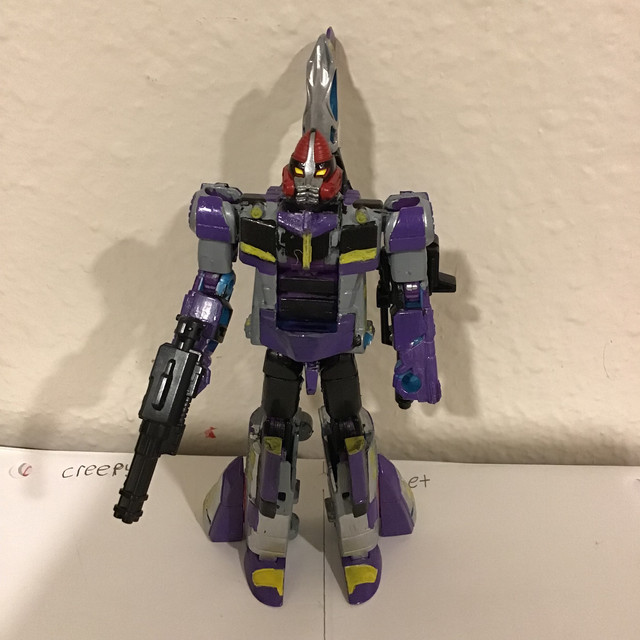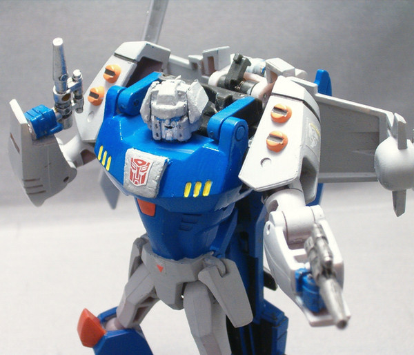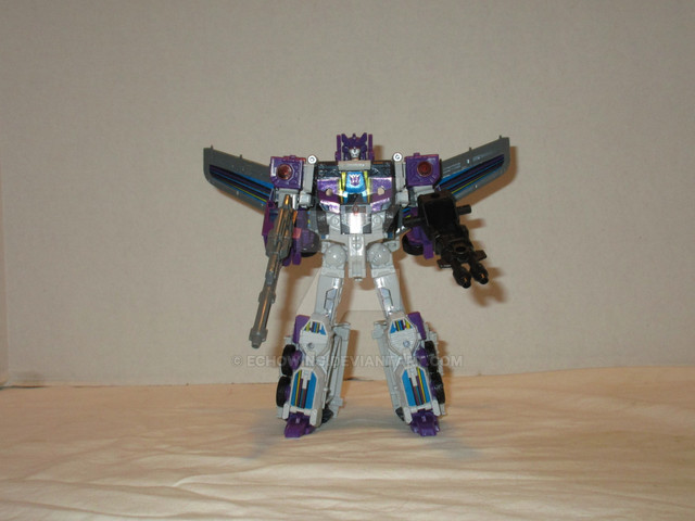 Well, Generations Selects finally granted my wish. Retooled from the Siege Spinister release, Rotorstorm is a perfect update of the old toy. I ended up modding him a bit, however. First, I painted one of his packed-in guns to match the other one - I used masking tape to conceal the yellow bits, then painted the rest with a layer of Testors Model Master Acrylic Medium Grey as a base coat, with another color of Testors Model Master paint (either Cobalt Blue or Deep Pearlescent Purple, I can't recall which). Beyond that, I added parts from the Shockwave Lab SL-38 kit (gap fillers) and the Matrix Workshop M-37 kit (guns/engine pods). I'm very happy with him.