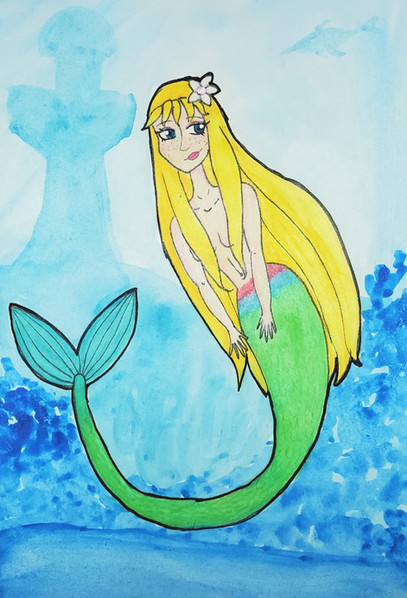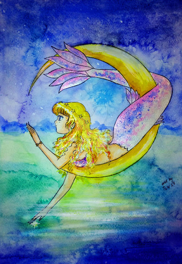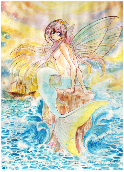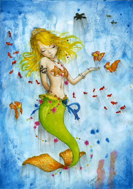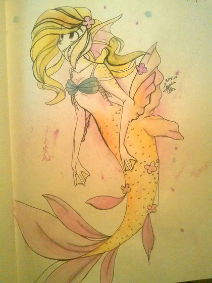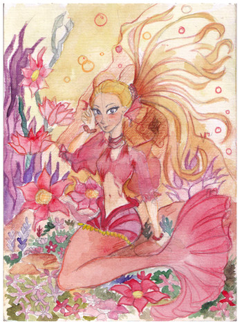 Ahem.. So for this It's Pencil, Ink (Micron Sakura Fine Point), Watercolors and Acrylics. I also added some extra sparkle to bring out her fin and hair from the background. I did that in PShopCS2. Would love some feedback! I was thinking about making this into a print but that all depends on when I can get to a good scanner.