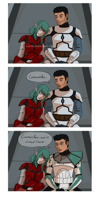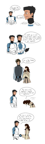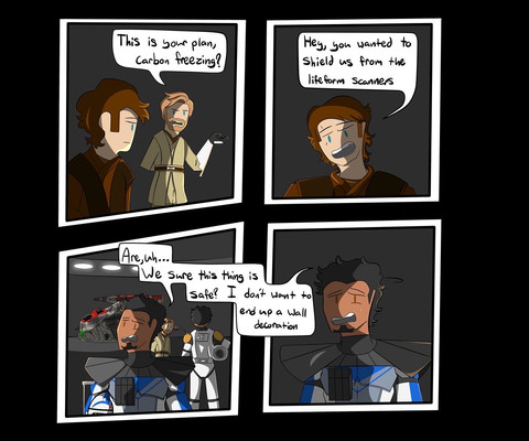 Rex and Mink always argue about washing the dishes. Mink and Rex both don't like doing it, but to make it fair one of them has to do something. Like Mink cooks dinner and clears half the table while Rex clears the other half and washes the dishes. However, he doesn't like washing the dishes, and he's not a really good cook either. So every time they argue, Mink would always win because she can sometimes get out of hand and scare Rex to death with her wolf form. Then we have Hatch and Lee at the background. Hatch was curious if they should stop them but Lee knows that it's not good if you interfere an argument with Mink. Things get scary. So, Lee and Hatch didn't do anything and just watch Mink scare the hell out of Rex. XD I love that part.I finally drew Star Wars stuff! TuT I hope you guys like this comic.