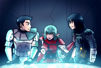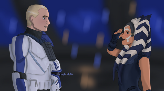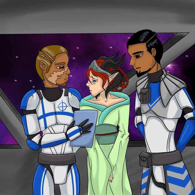 So the sad man at lower right corner is my Star Wars OC, Commander Lee. Some may remember him, but for those who don't you'll get to know him soon. In this drawing, Lee is remembering the past with his commanding officers. The girl is General Mink Nightstorm, the first girl he fell in love. The man with the scar is Commander Nyx, and the man behind him is General Harper Kirkus. Lee has a very close relationship with these three. Commander Nyx was his mentor and most favorite officer in the Clone Army. Kirkus was always there for Lee whenever he needed to relax or talk. Now, the reason why Lee is crying is because he's remembering the good moments with those three before his life was ruined. His heart was broken when he found out Mink was in love with Rex, and Commander Nyx and General Kirkus both died on the same day and place. I wrote a story about their deaths here, but I think I'll just redraw it into a comic. It'll show you guys a better understanding of what's going on.ΒRelated content