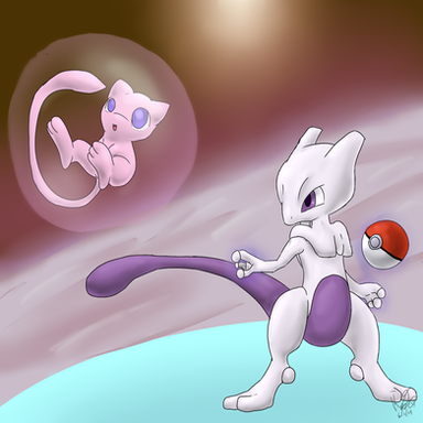Mew attempts to heal a fatally wounded Manaphy,while Mewtwo defends them from an old foe.Had this thought for a couple months. I was working my way to doing it,but I was blessed with my first batch of commissions for non pokemon related work